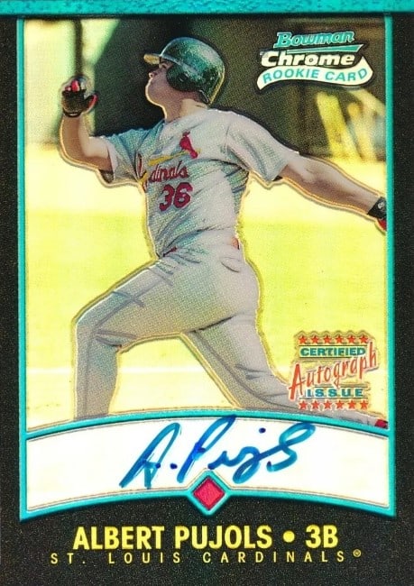 Like Yadier Molina, collectors have their pick of Albert Pujols cards, including over a dozen rookie Cardinals baseball cards and associated parallels. The 2001 Topps Traded and 2001 Topps Chrome are popular choices, but the really special one is the 2001 Bowman Chrome Albert Pujols autographed card. Only 500 hand-numbered cards were made available by redemption cards in packs, so all of those that can exist are already out in the market. The card has sold as high as $168,000 for a PSA 10, but most high-grade cards are in the $10,000-$20,000 range. It’s worth noting that ink on some of the cards has faded with time, so make sure you look at the autograph carefully before buying.