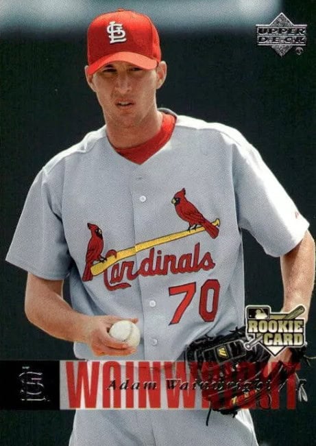 Adam Wainwright’s true rookie cards show him in his pre-Cardinals days as a Braves prospect. In his rookie season, Wainwright didn’t have a Topps card, but his Upper Deck issue is a beauty. Featuring a full-bleed design and a high-contrast photo, this card celebrates his rookie season as a relief pitcher. The card is worth around $5 in ungraded condition, or $50-$100 for a PSA 9.