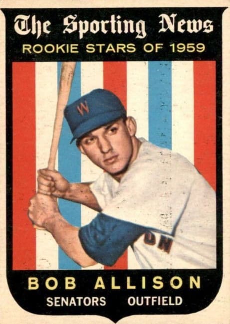 The 1959 Topps #116 is the essential rookie card for Bob Allison collectors. Even though it depicts him as a Washington Senator, it is the first major release featuring the man who would lead the Minnesota offense for ten years. A PSA 7 (Near Mint) copy of this card typically sells for approximately $120. Finding examples with perfect centering is the biggest challenge for this specific year, as the 1959 set is known for its narrow borders and frequent print tilts.