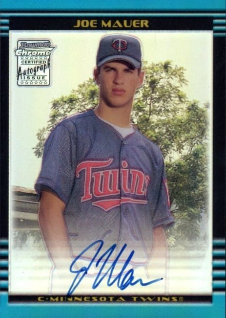 The 2002 Bowman Chrome #391 is the definitive Joe Mauer rookie card. Collectors specifically hunt for the “Refractor” versions of this card, which feature a rainbow sheen when held under light. A standard PSA 10 (Gem Mint) copy of the base Chrome card is valued at approximately $450. As a new Hall of Famer, interest in his early Twins baseball cards has reached a new peak, making Mauer a stable investment for long-term collectors.