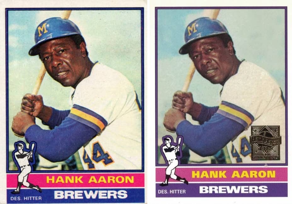 Next, examine the card back. Many reprints will include phrases such as “Reprint,” “Commemorative Edition,” or display a modern logo or foil stamp on the front. Comparing the card’s back to exemplars – available via image searches – can help confirm your findings. This is one area where online auction sites are not helpful. Type in “1976 Topps Hank Aaron” for example, and you’ll be inundated with reprints too, even if you filter your results. Sellers are sometimes myopic to the needs of collectors who want vintage cards.